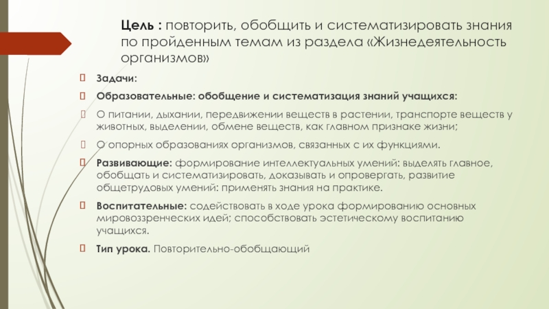Развивающие: формирование интеллектуальных умений: выделять главное, обобщать и систематизировать, доказывать и опровергать, развитие общетрудовых умений: применять знания на практике.