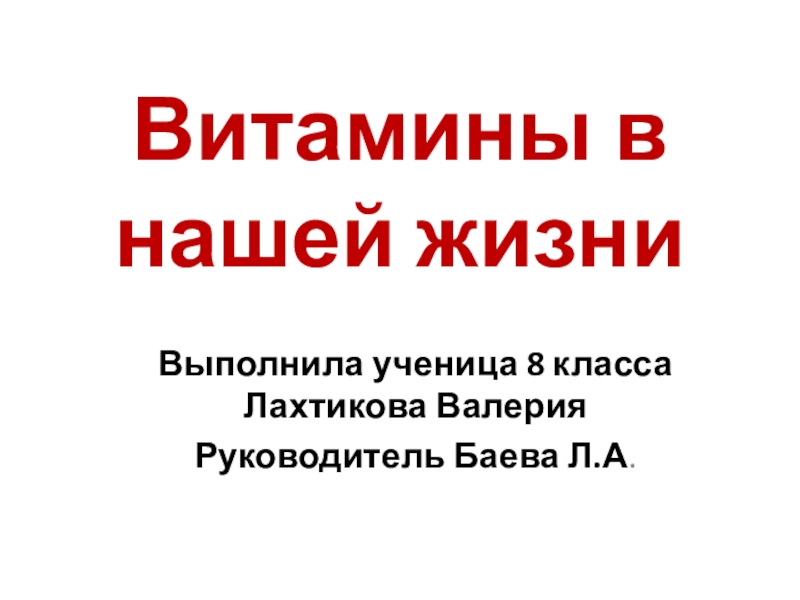 Витамины в нашей жизниВыполнила ученица 8 класса Лахтикова ВалерияРуководитель Баева Л.А.
