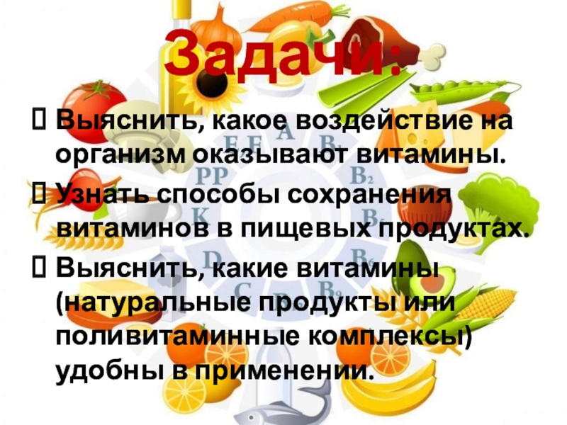 Задачи:Выяснить, какое воздействие на организм оказывают витамины.Узнать способы сохранения витаминов в пищевых продуктах.Выяснить, какие витамины (натуральные продукты