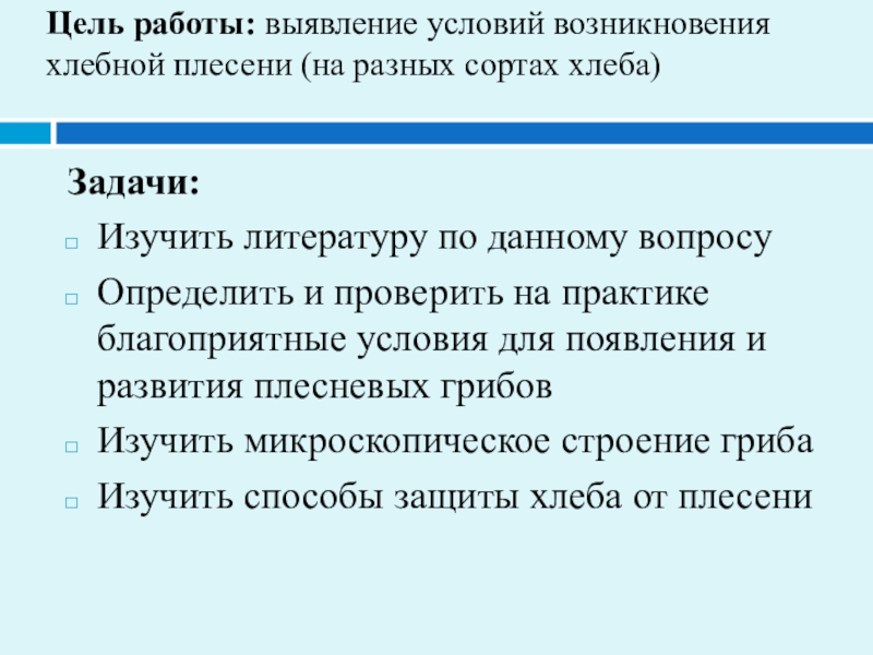 Цель работы: выявление условий возникновения хлебной плесени (на разных сортах хлеба) Задачи:Изучить литературу по данному вопросуОпределить и проверить на практике благоприятные условия для появления и развития плесневых грибовИзучить микроскопическое строение гриба Изучить способы защиты хлеба от