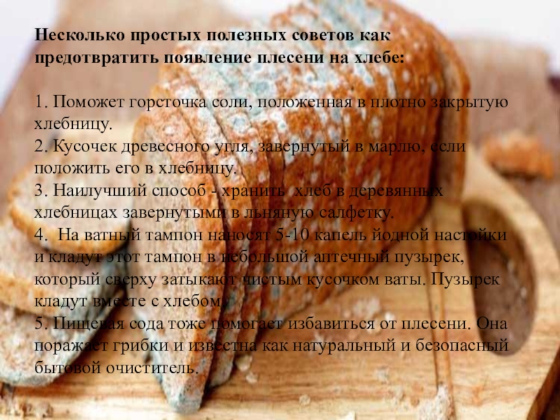 Слайд 18Несколько простых полезных советов как предотвратить появление плесени на хлебе: 1. Поможет