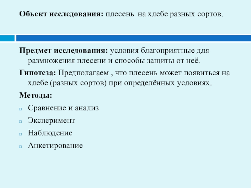 Объект исследования: плесень на хлебе разных сортов. Предмет исследования: условия благоприятные для размножения плесени и способы защиты
