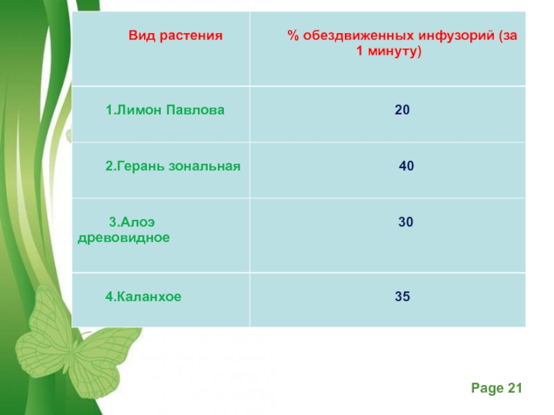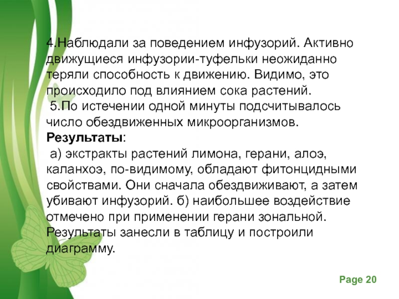 а) экстракты растений лимона, герани, алоэ, каланхоэ, по-видимому, обладают фитонцидными свойствами. Они сначала обездвиживают, а затем убивают инфузорий. б) наибольшее воздействие отмечено при применении герани зональной.