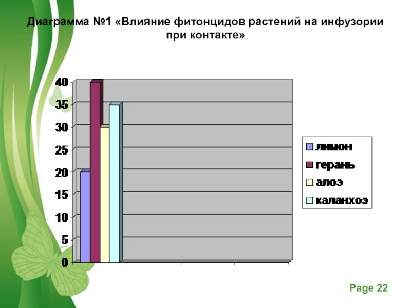 Слайд 22Диаграмма №1 «Влияние фитонцидов растений на инфузории при контакте»