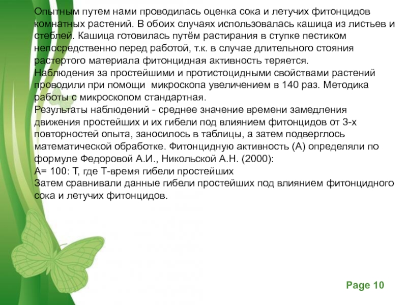 Результаты наблюдений - среднее значение времени замедления движения простейших и их гибели под влиянием фитонцидов от 3-х повторностей опыта, заносилось в таблицы, а затем подверглось математической обработке. Фитонцидную активность (А) определяли по формуле Федоровой А.И., Никольской А.Н. (2000):