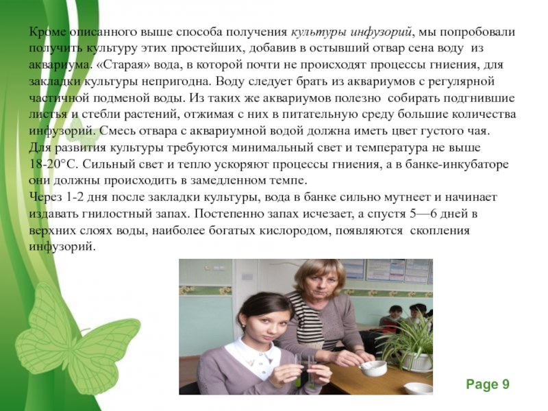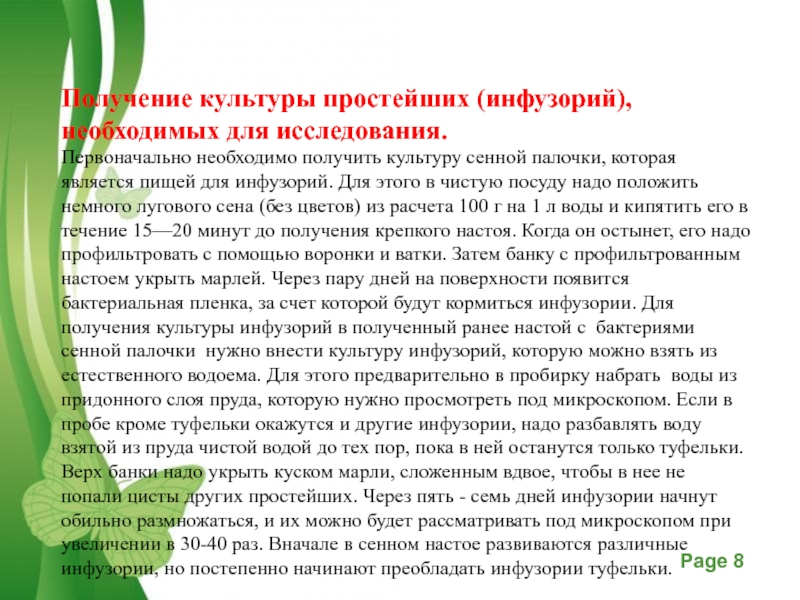 Слайд 8Получение культуры простейших (инфузорий), необходимых для исследования.
