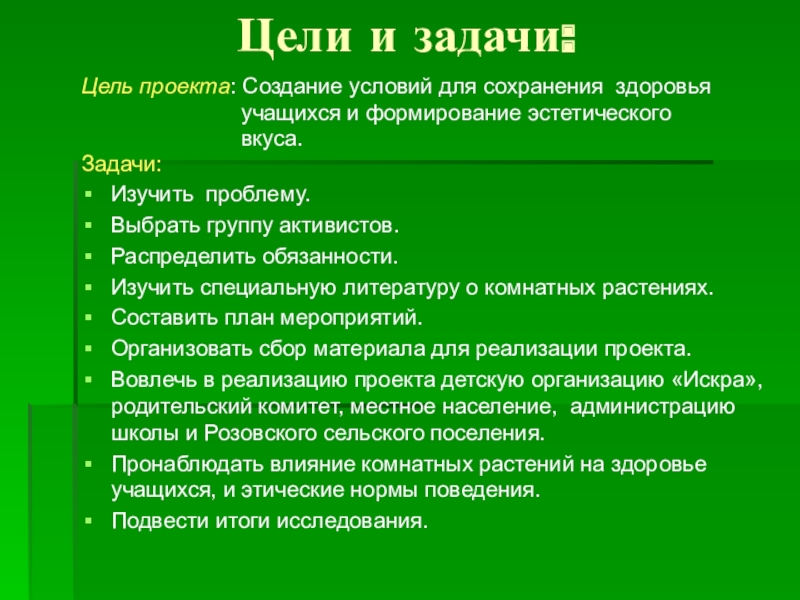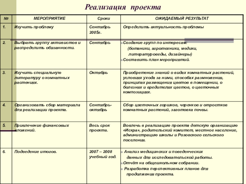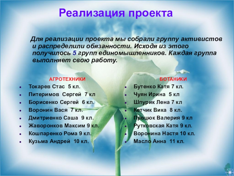Для реализации проекта мы собрали группу активистов и распределили обязанности. Исходя из этого получилось 5 групп единомышленников. Каждая группа выполняет свою работу.