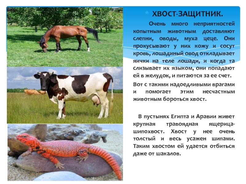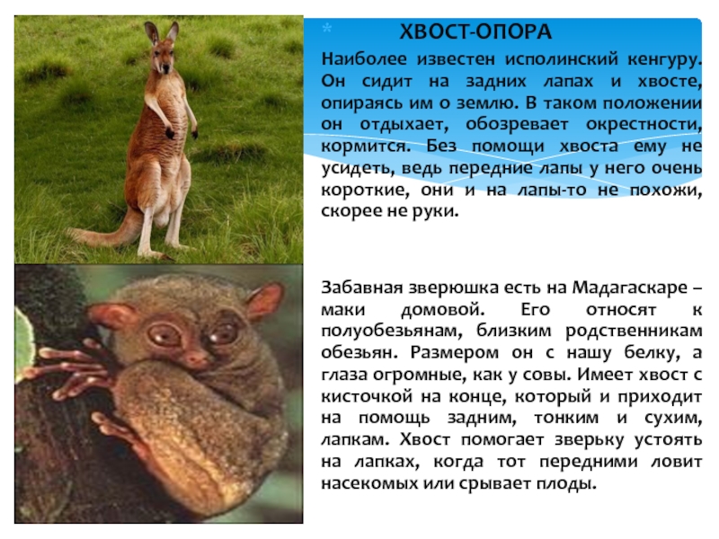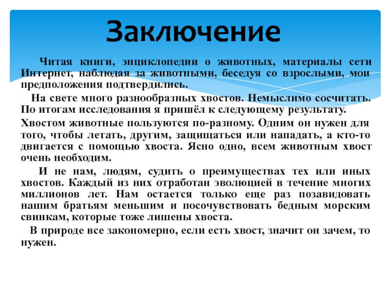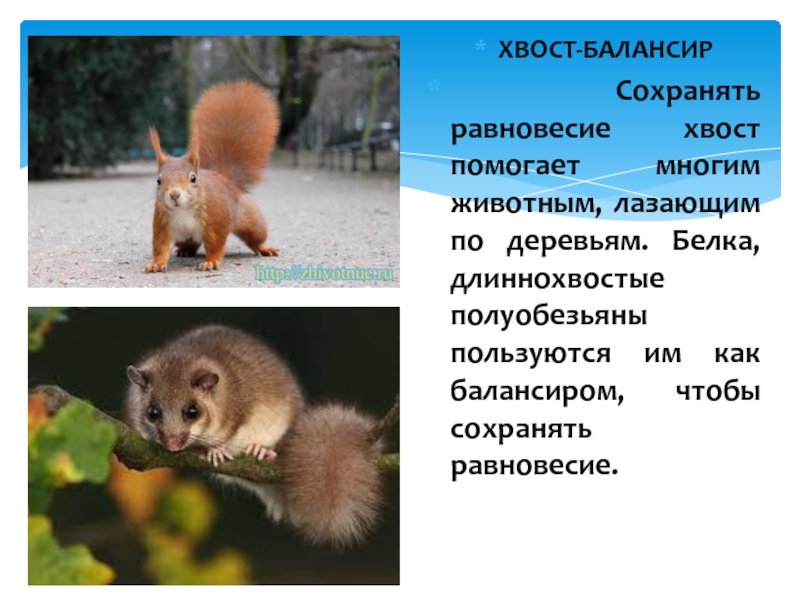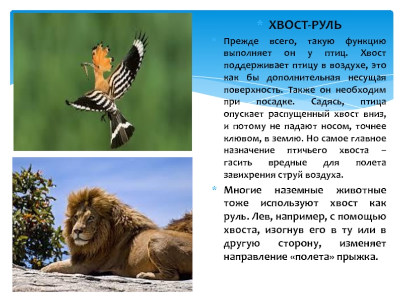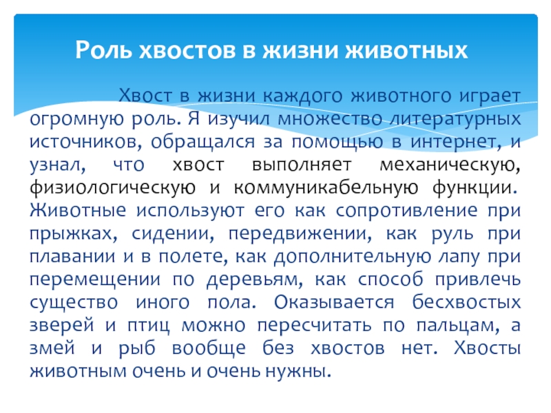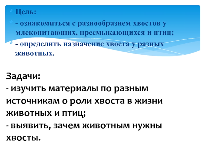 - изучить материалы по разным источникам о роли хвоста в жизни животных и птиц;