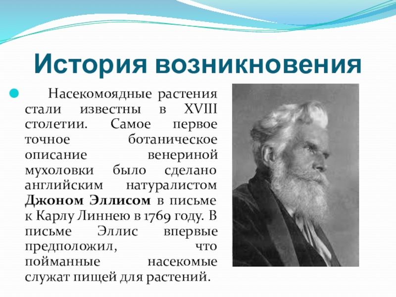 первое точное ботаническое описание венериной мухоловки было сделано английским натуралистом Джоном Эллисом в письме к Карлу Линнею в 1769 году. В письме Эллис впервые предположил, что пойманные насекомые служат пищей для растений.