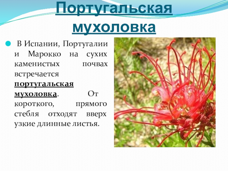 встречается португальская мухоловка. От короткого, прямого стебля отходят вверх узкие длинные листья.