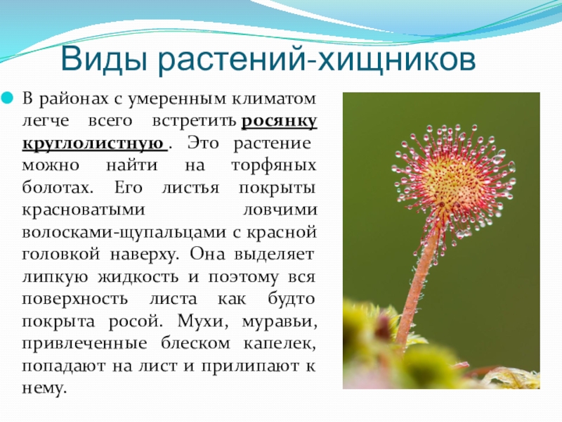круглолистную . Это растение можно найти на торфяных болотах. Его листья покрыты красноватыми ловчими волосками-щупальцами с красной головкой наверху. Она выделяет липкую жидкость и поэтому вся поверхность листа как будто покрыта росой. Мухи, муравьи, привлеченные блеском капелек, попадают на лист и прилипают к нему.