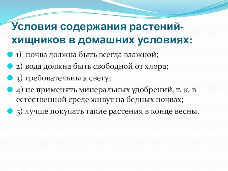 Слайд 14Условия содержания растений-хищников в домашних условиях: