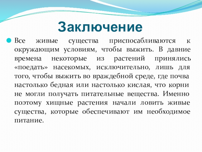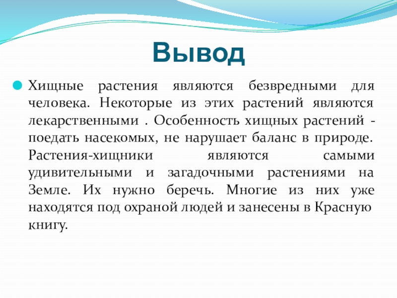 лекарственными . Особенность хищных растений - поедать насекомых, не нарушает баланс в природе. Растения-хищники являются самыми удивительными и загадочными растениями на Земле. Их нужно беречь. Многие из них уже находятся под охраной людей и занесены в Красную книгу.