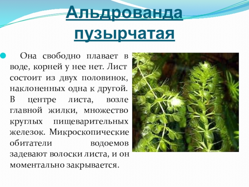 Лист состоит из двух половинок, наклоненных одна к другой. В центре листа, возле главной жилки, множество круглых пищеварительных железок. Микроскопические обитатели водоемов задевают волоски листа, и он моментально закрывается.