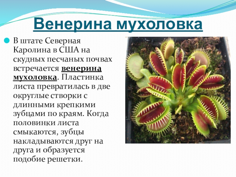 встречается венерина мухоловка. Пластинка листа превратилась в две округлые створки с длинными крепкими зубцами по краям. Когда половинки листа смыкаются, зубцы накладываются друг на друга и образуется подобие решетки.