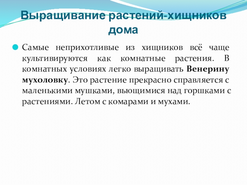 растения. В комнатных условиях легко выращивать Венерину мухоловку. Это растение прекрасно справляется с маленькими мушками, вьющимися над горшками с растениями. Летом с комарами и мухами.