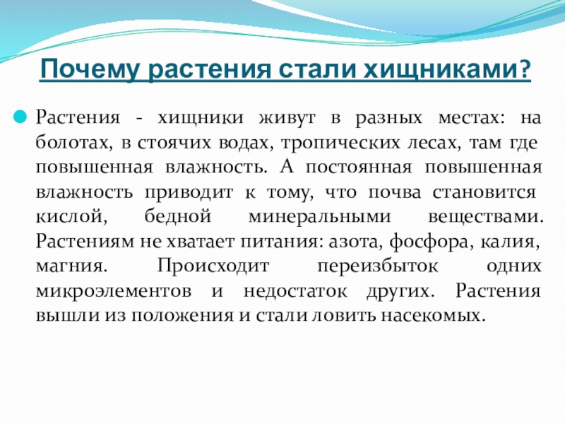 времена некоторые из растений принялись «поедать» насекомых, исключительно, лишь для того, чтобы выжить во враждебной среде, где почва настолько бедная или настолько кислая, что корни не могли получать питательные вещества. Именно поэтому хищные растения начали ловить живые существа, которые обеспечивают им необходимое питание.