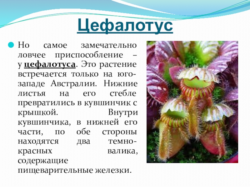 Но самое замечательно ловчее приспособление – у цефалотуса. Это растение встречается только