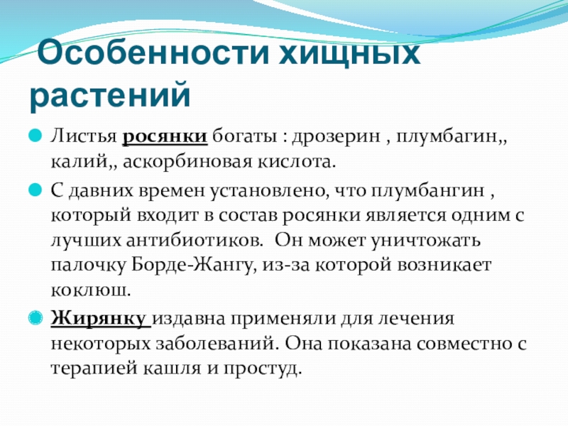 Листья росянки богаты : дрозерин , плумбагин,, калий,, аскорбиновая кислота.