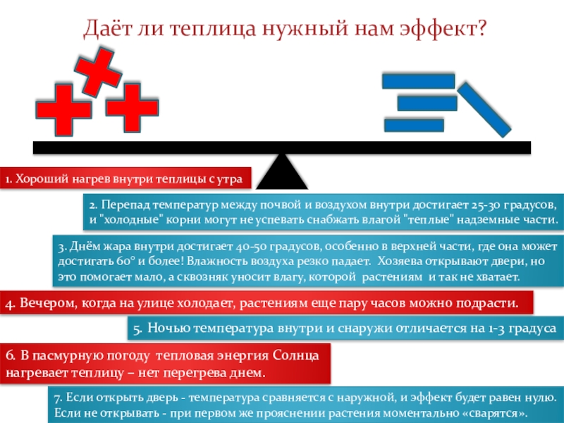 6. В пасмурную погоду тепловая энергия Солнца нагревает теплицу – нет перегрева днем.