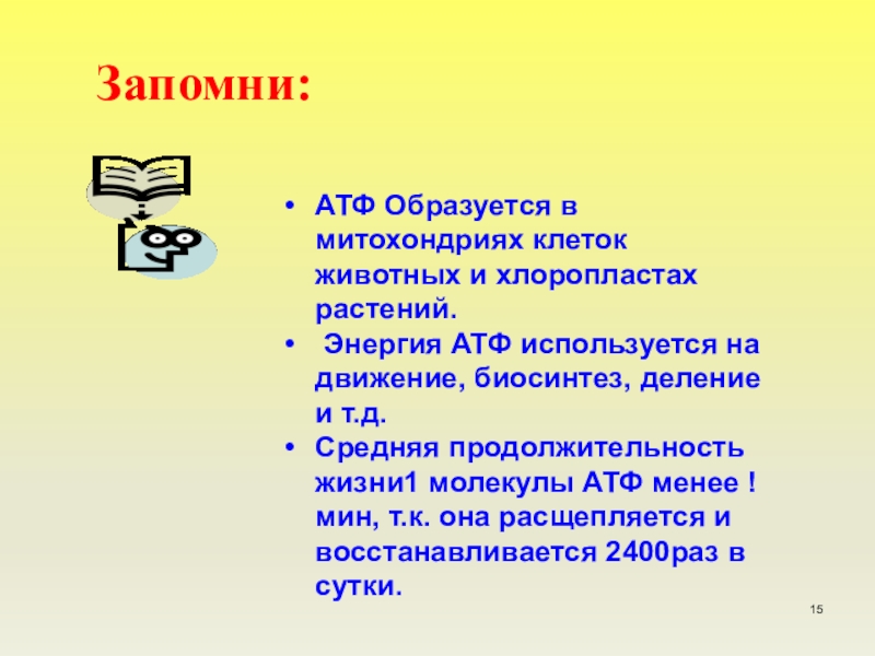 Средняя продолжительность жизни1 молекулы АТФ менее !мин, т.к. она расщепляется и восстанавливается 2400раз в сутки.