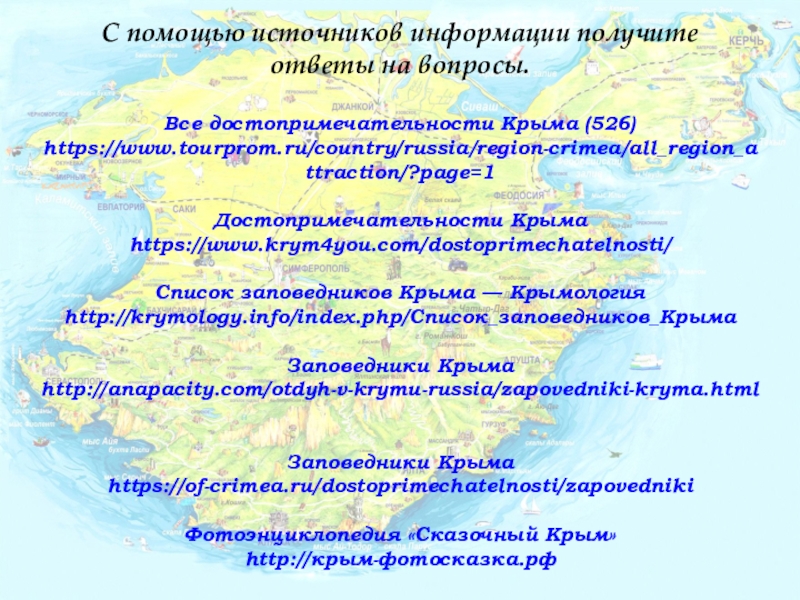 С помощью источников информации получите ответы на вопросы. Все достопримечательности Крыма (526)  https://www.tourprom.ru/country/russia/region-crimea/all_region_attraction/?page=1   Достопримечательности Крыма  https://www.krym4you.com/dostoprimechatelnosti/