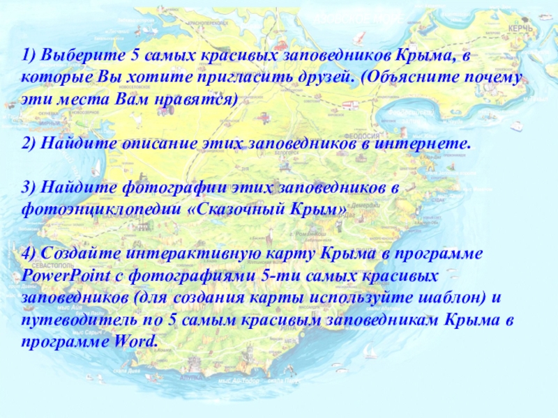 4) Создайте интерактивную карту Крыма в программе PowerPoint с фотографиями 5-ти самых красивых заповедников (для создания карты используйте шаблон) и путеводитель по 5 самым красивым заповедникам Крыма в программе Word.