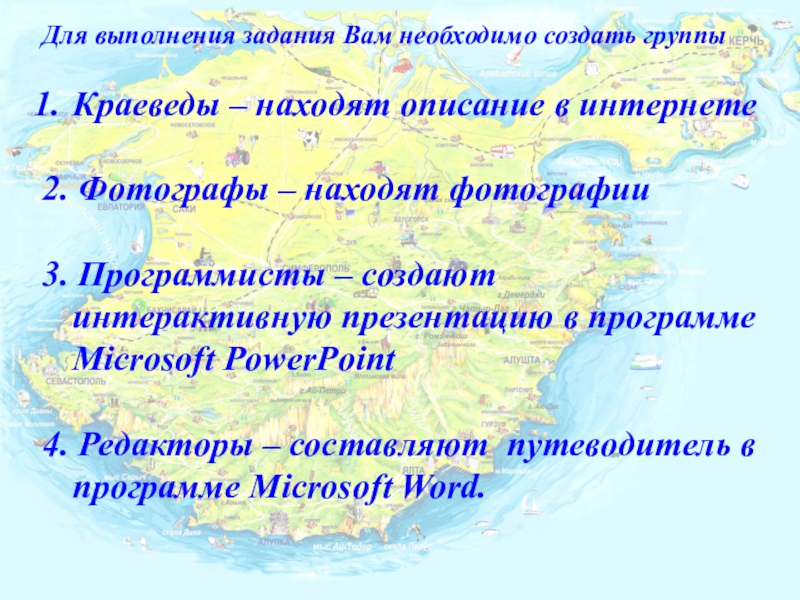 Для выполнения задания Вам необходимо создать группыКраеведы – находят описание в интернете2. Фотографы – находят фотографии3. Программисты