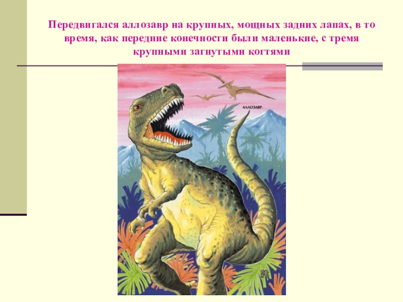 Слайд 44Передвигался аллозавр на крупных, мощных задних лапах, в то время, как