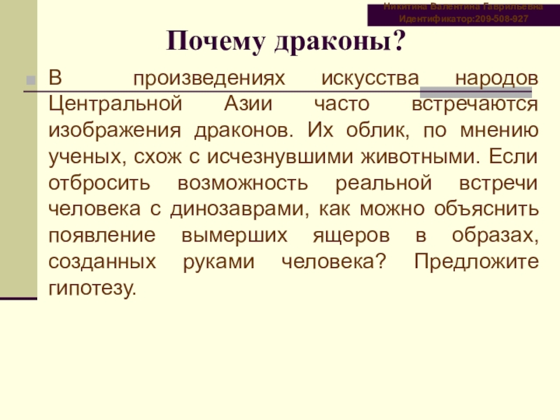 Их облик, по мнению ученых, схож с исчезнувшими животными. Если отбросить возможность реальной встречи человека с динозаврами, как можно объяснить появление вымерших ящеров в образах, созданных руками человека? Предложите гипотезу.