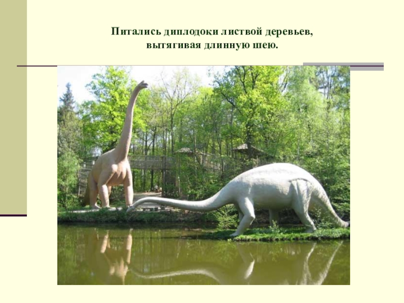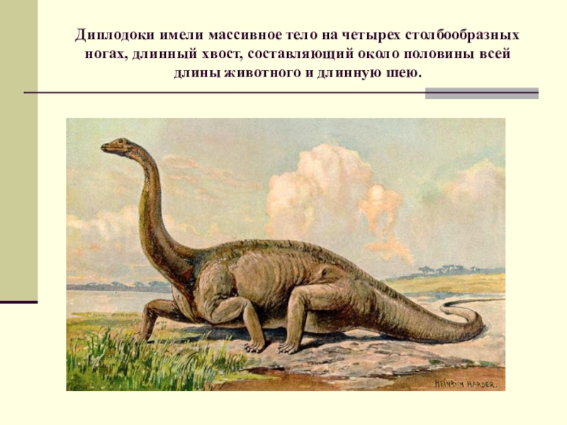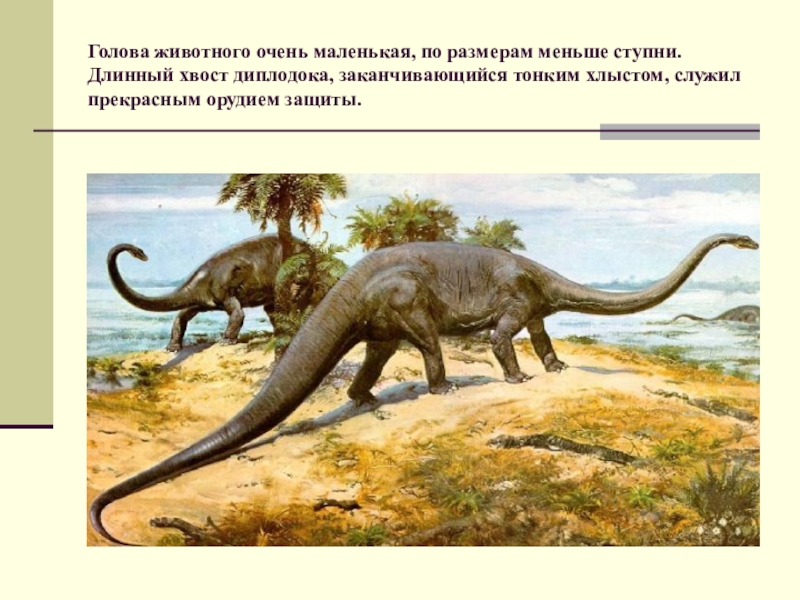 Слайд 14Диплодоки имели массивное тело на четырех столбообразных ногах, длинный хвост, составляющий