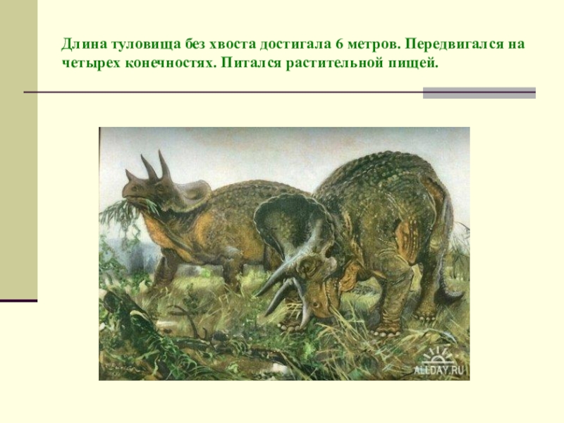 Слайд 30Длина туловища без хвоста достигала 6 метров. Передвигался на четырех конечностях.