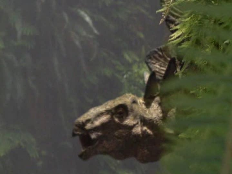 увидела скелет огромного ящера. Он лежал на боку, подвернув длинный хвост и скрестив тяжелые задние лапы…Череп чудовища, около двух метров длины, на затылке переходил в огромный костяной воротник, усаженный тупыми шипами. Над глазами торчали два длинных рога, третий рог сидел на носу, а морда оканчивалась клювом…»