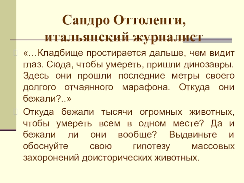 Откуда бежали тысячи огромных животных, чтобы умереть всем в одном месте? Да и бежали ли они вообще? Выдвиньте и обоснуйте свою гипотезу массовых захоронений доисторических животных.