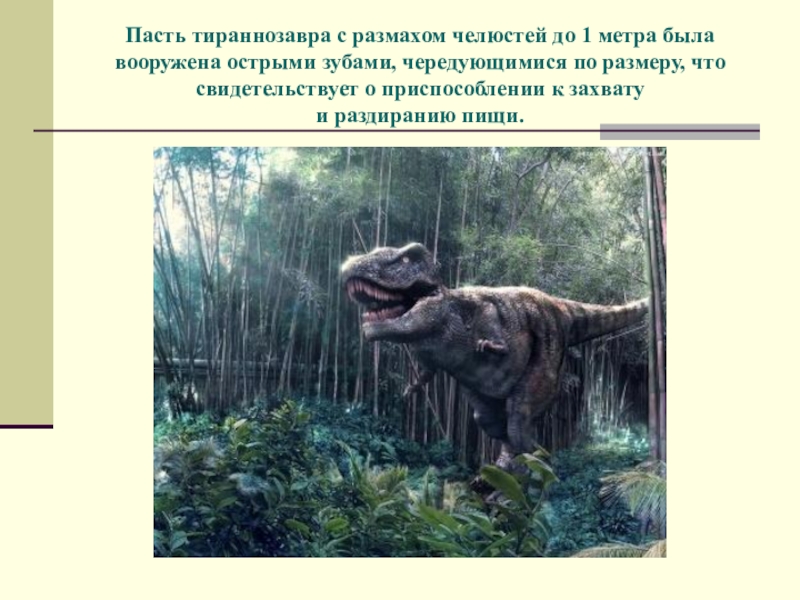 Слайд 49Пасть тираннозавра с размахом челюстей до 1 метра была вооружена острыми