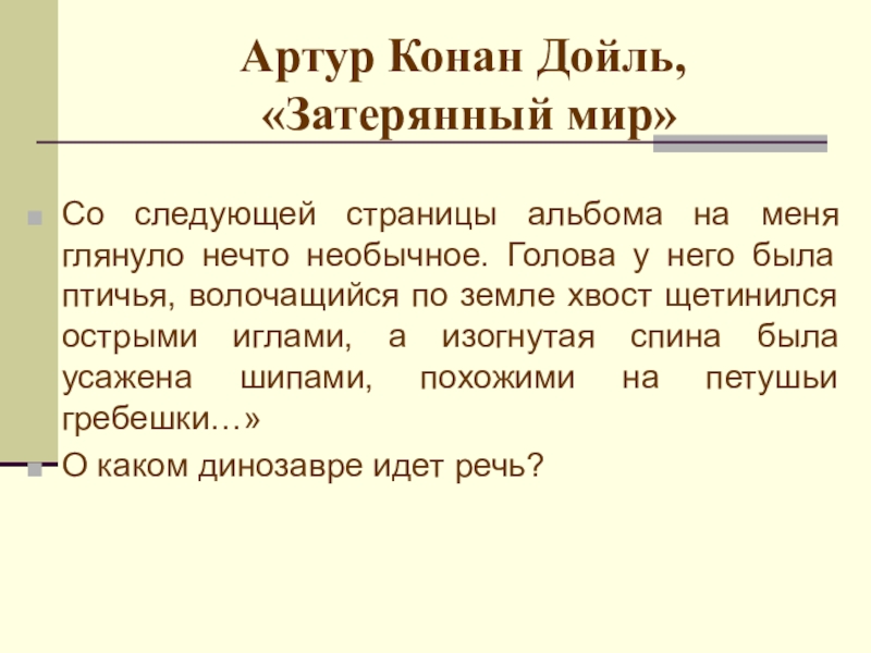 краем обрыва над головами остолбеневших людей. Чудовище высоко несло свою горбоносую голову. Спина круто спадала в мощный хвост, подпиравший динозавра сзади. И почти под самой шеей торчали две тонкие лапы, такие крошечные по сравнению с гигантским туловищем и головой…»