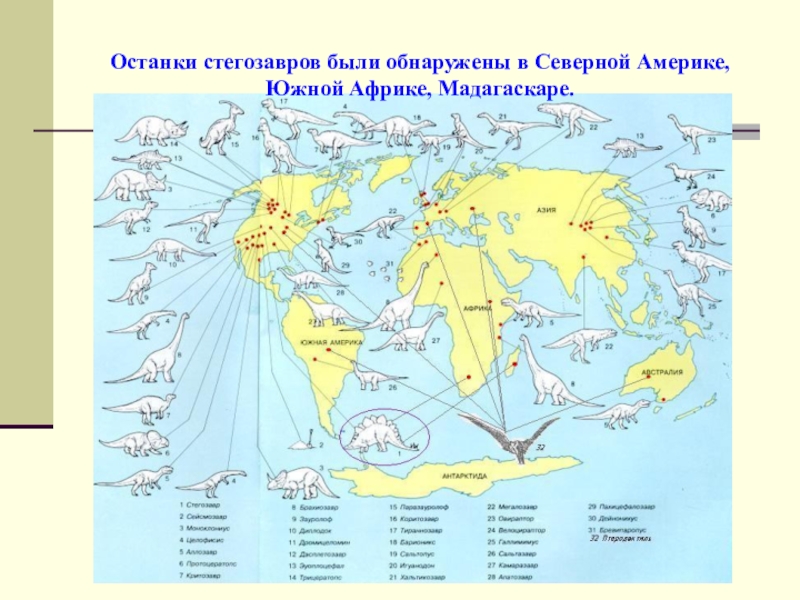 Слайд 28Останки стегозавров были обнаружены в Северной Америке, Южной Африке, Мадагаскаре.