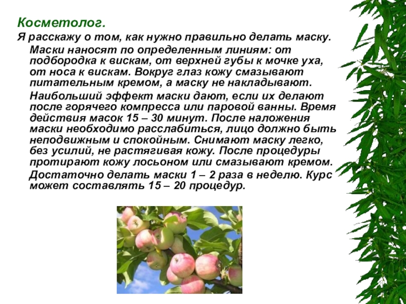начнешь верить, что яблоки – чуть ли не универсальное профилактическое и лечебное средство. Но это еще не все. Яблоки могут сказать свое слово и в косметологии.