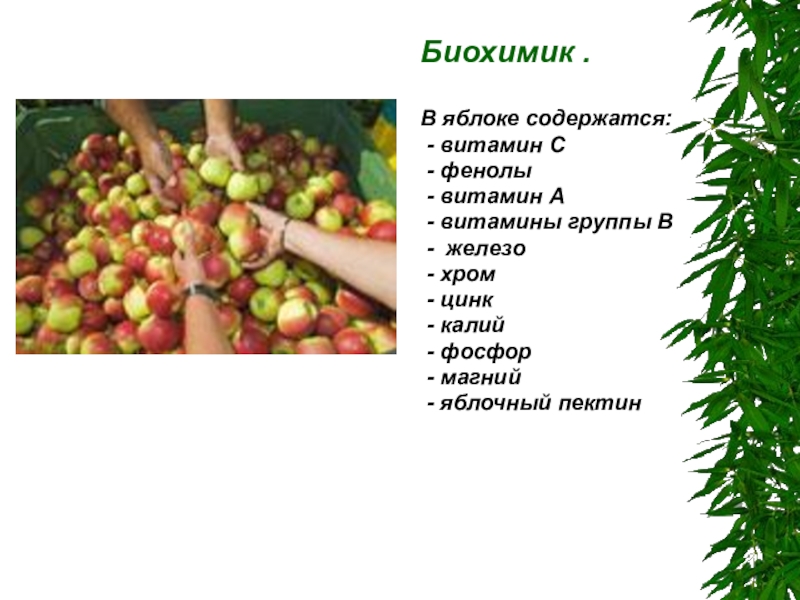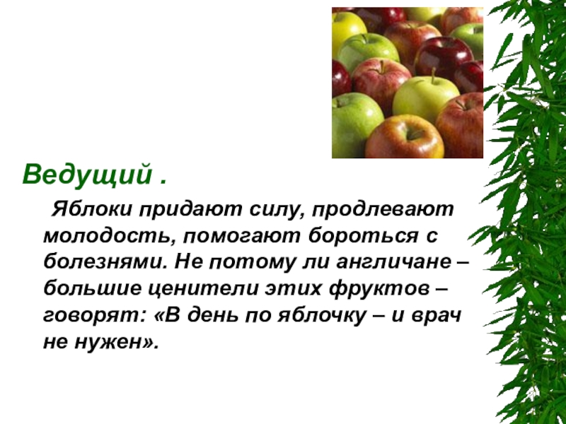 бороться с болезнями. Не потому ли англичане – большие ценители этих фруктов – говорят: «В день по яблочку – и врач не нужен».