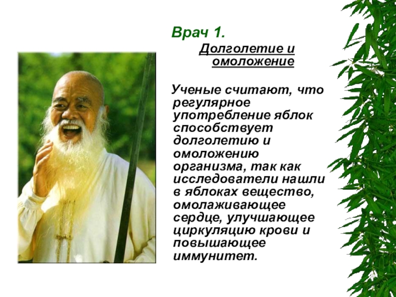 употребление яблок способствует долголетию и омоложению организма, так как исследователи нашли в яблоках вещество, омолаживающее сердце, улучшающее циркуляцию крови и повышающее иммунитет.