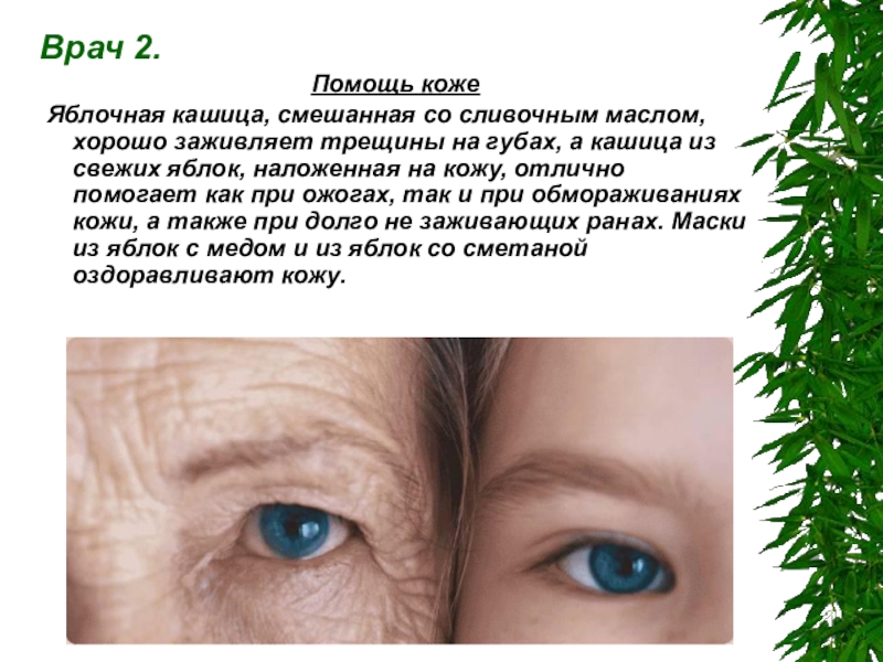 на губах, а кашица из свежих яблок, наложенная на кожу, отлично помогает как при ожогах, так и при обмораживаниях кожи, а также при долго не заживающих ранах. Маски из яблок с медом и из яблок со сметаной оздоравливают кожу.
