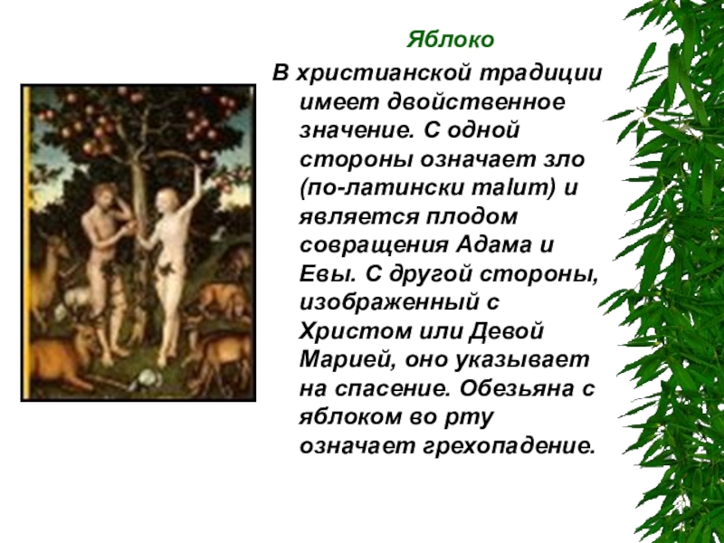 означает зло (по-латински malum) и является плодом совращения Адама и Евы. С другой стороны, изображенный с Христом или Девой Марией, оно указывает на спасение. Обезьяна с яблоком во рту означает грехопадение.