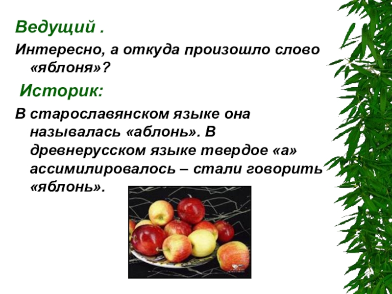 языке она называлась «аблонь». В древнерусском языке твердое «а» ассимилировалось – стали говорить «яблонь».