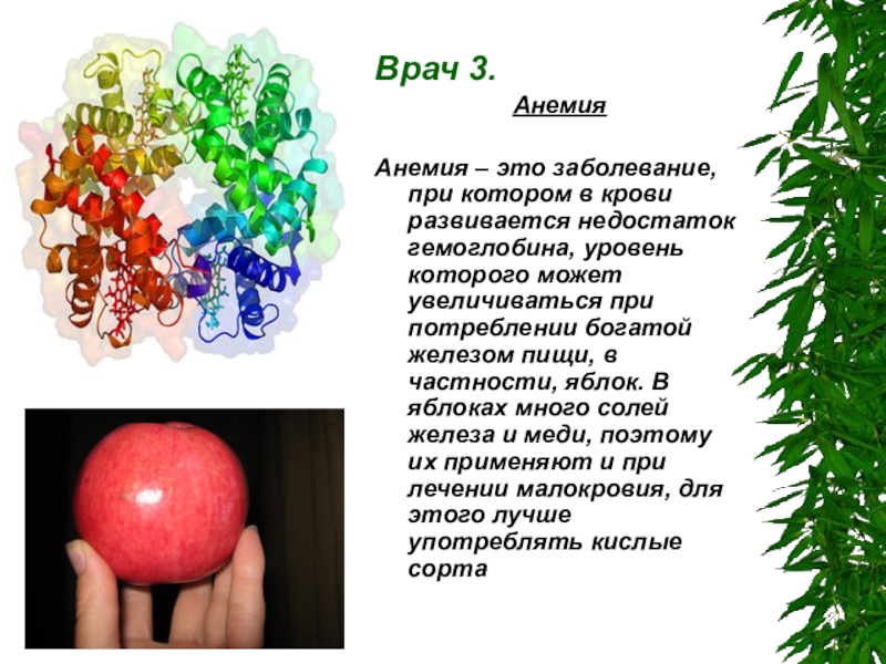 гемоглобина, уровень которого может увеличиваться при потреблении богатой железом пищи, в частности, яблок. В яблоках много солей железа и меди, поэтому их применяют и при лечении малокровия, для этого лучше употреблять кислые сорта