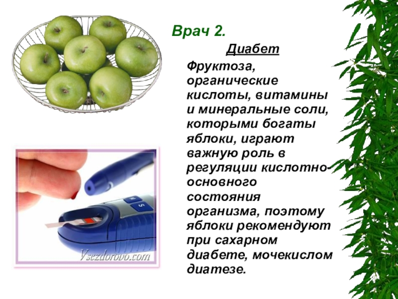 богаты яблоки, играют важную роль в регуляции кислотно-основного состояния организма, поэтому яблоки рекомендуют при сахарном диабете, мочекислом диатезе.