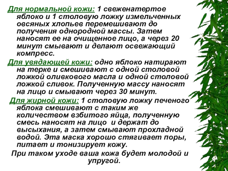 Слайд 26Для нормальной кожи: 1 свеженатертое яблоко и 1 столовую ложку измельченных