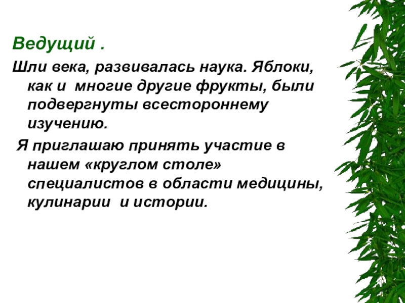 Я приглашаю принять участие в нашем «круглом столе» специалистов в области медицины, кулинарии и истории.