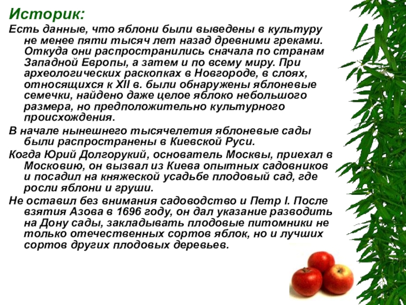 В начале нынешнего тысячелетия яблоневые сады были распространены в Киевской Руси.