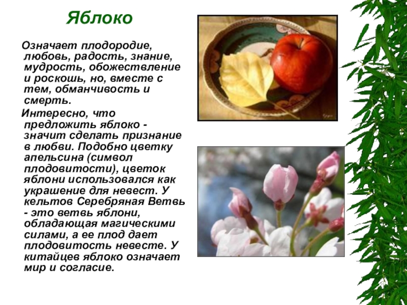 Интересно, что предложить яблоко - значит сделать признание в любви. Подобно цветку апельсина (символ плодовитости), цветок яблони использовался как украшение для невест. У кельтов Серебряная Ветвь - это ветвь яблони, обладающая магическими силами, а ее плод дает плодовитость невесте. У китайцев яблоко означает мир и согласие.
