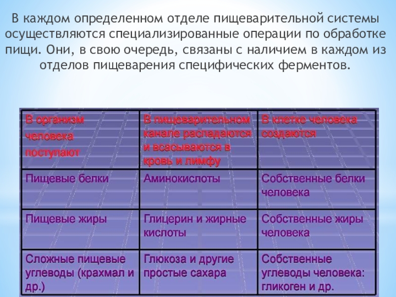 пищи. Они, в свою очередь, связаны с наличием в каждом из отделов пищеварения специфических ферментов.